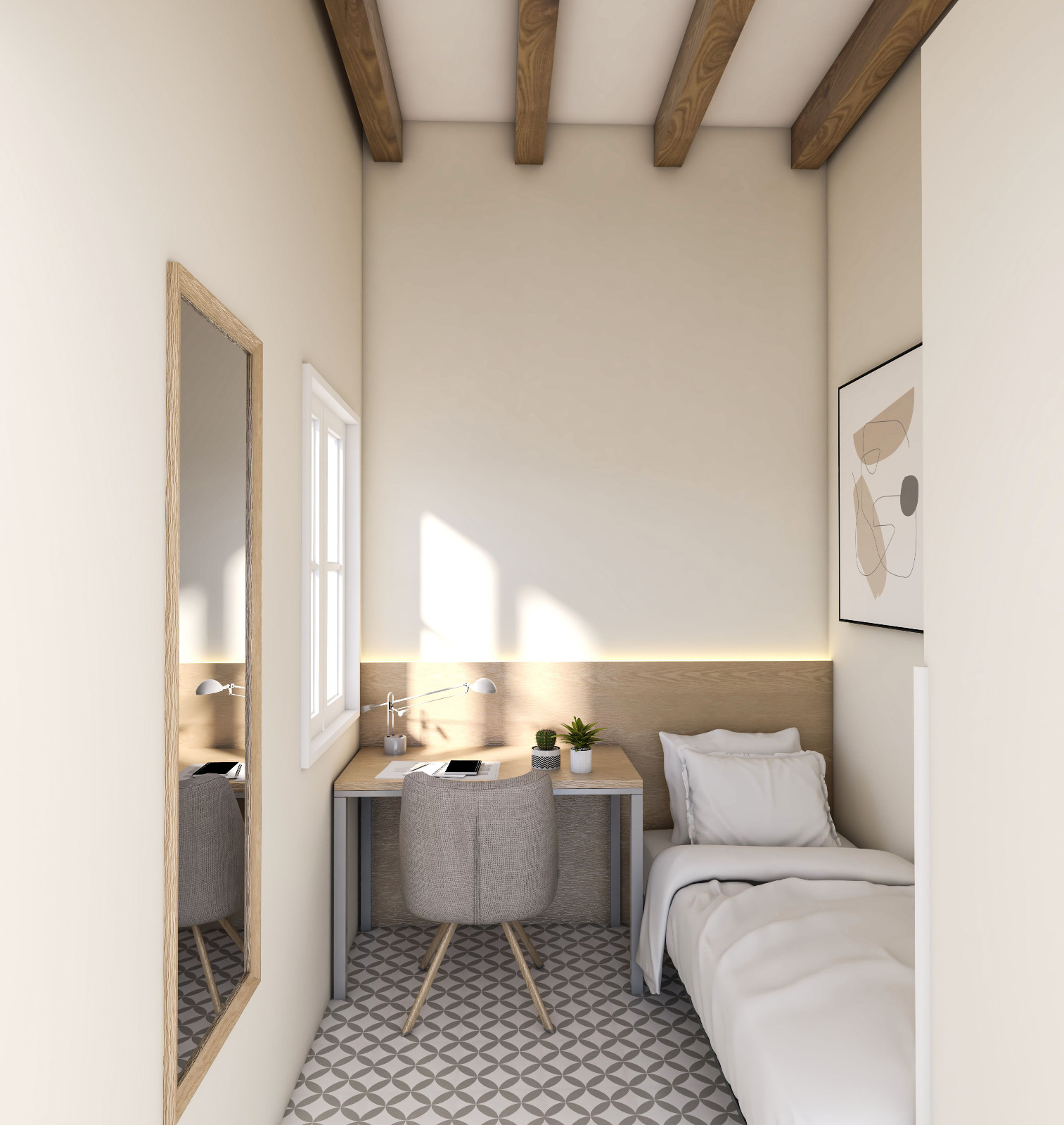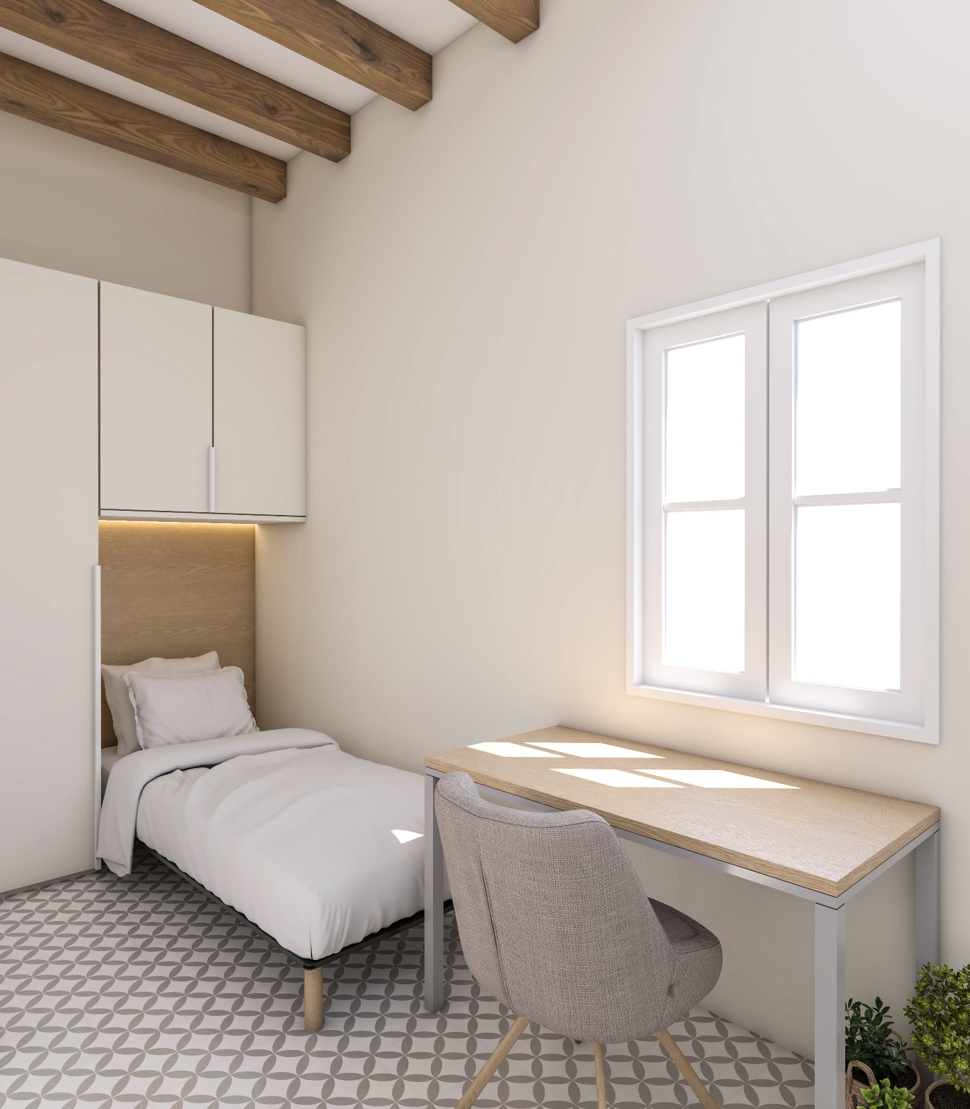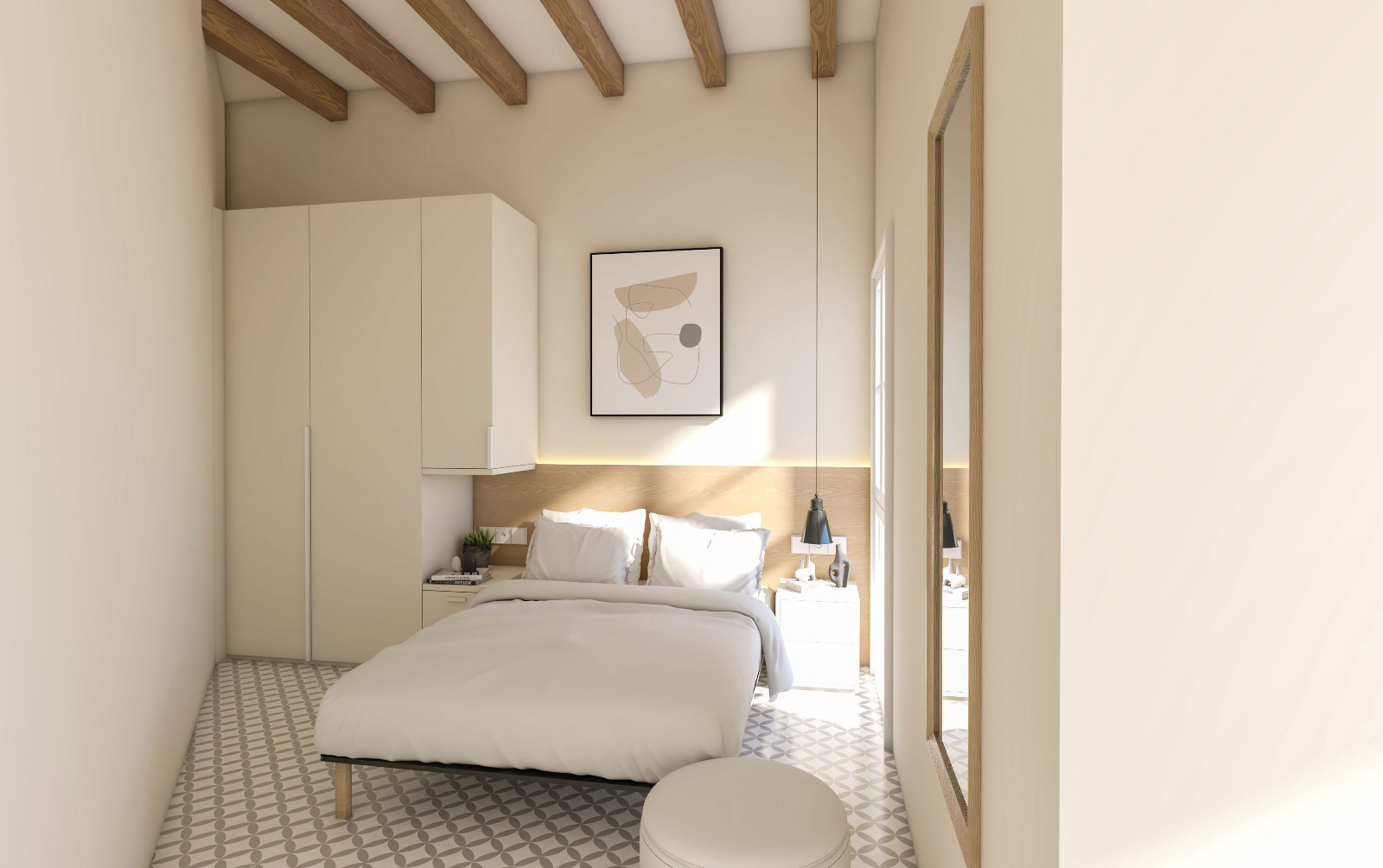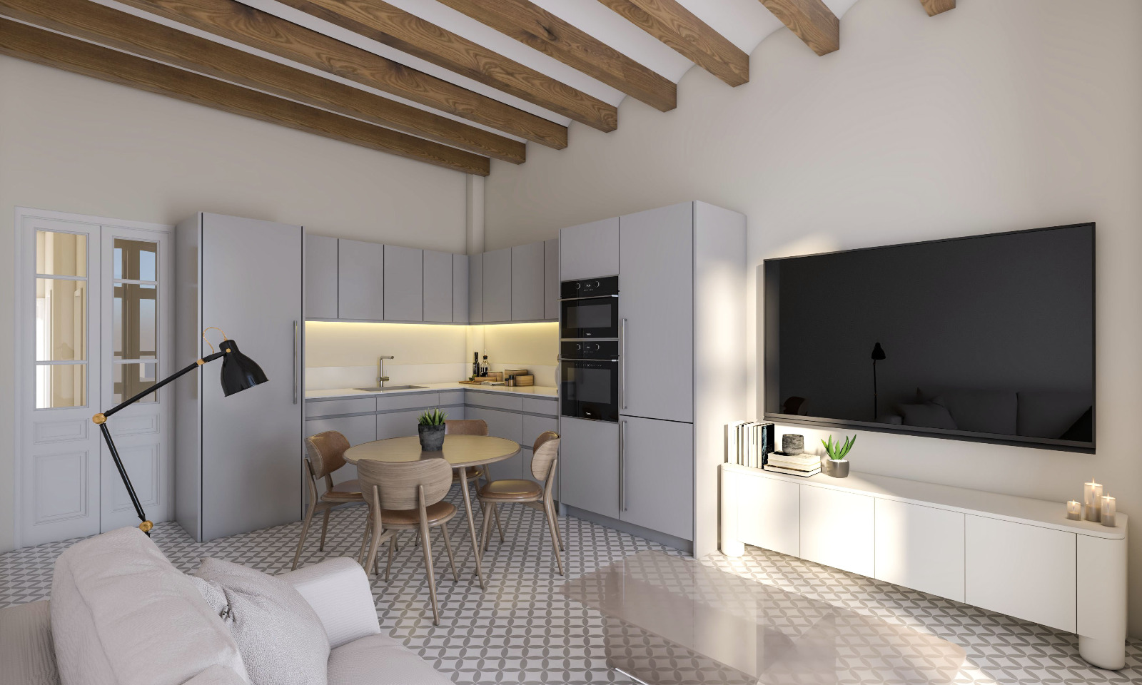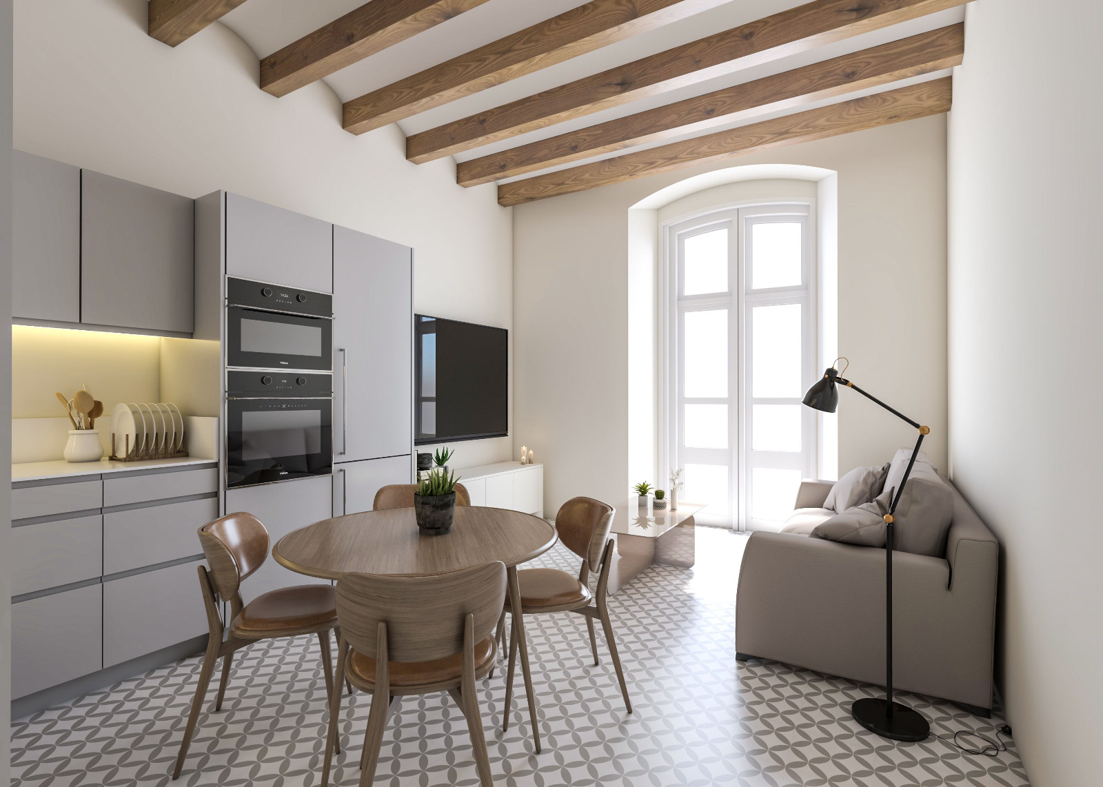 També disposen d’una cuina oberta totalment equipada que connecta amb una sala d’estar àmplia i lluminosa que convida a viure-hi amb tota comoditat. A la vegada, dona sortida al carrer a través d’un balcó. La llar, també consta d’un bany complert amb materials de la marca Roca o similar, paviment porcel·lànic i il·luminació LED a tota la vivenda.